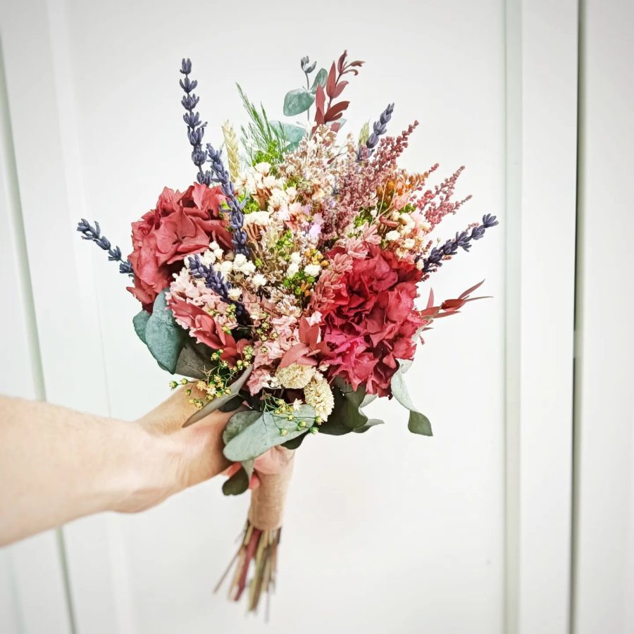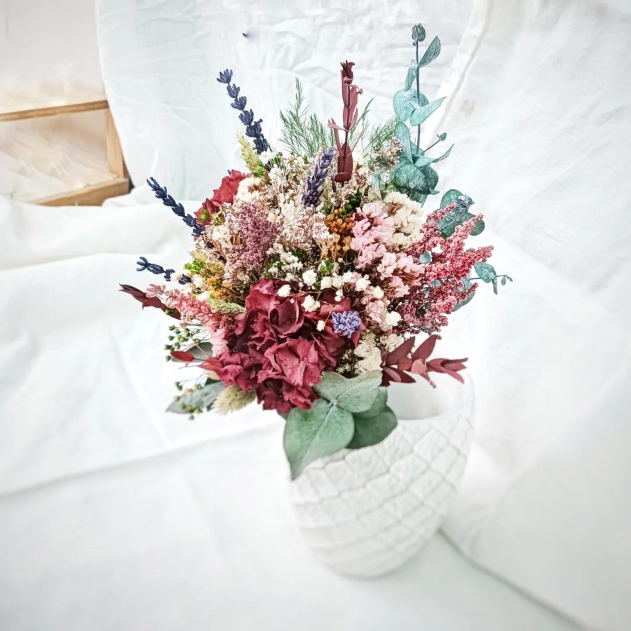 - Combinación de flores: Limoniums, paniculata, lavanda, hortensia y eucaliptos entre otras flores preservadas y liofilizadas.