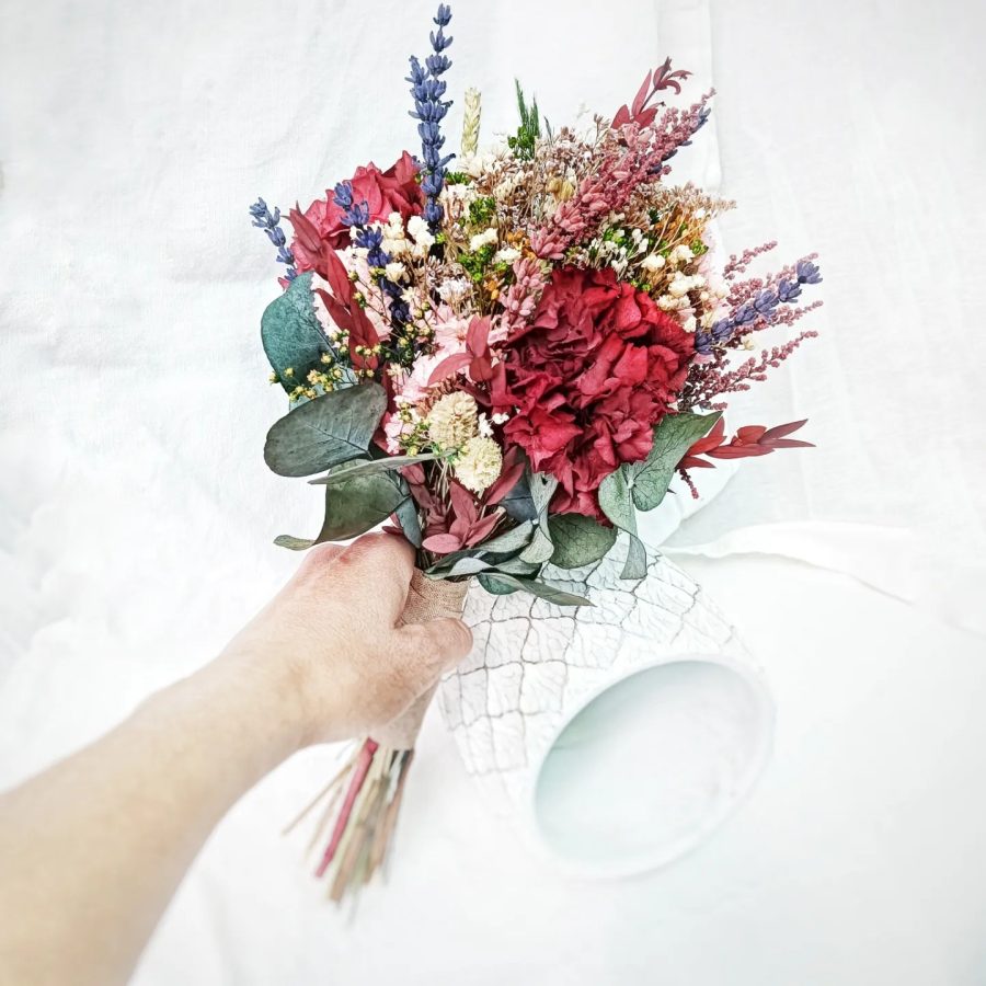 Como flor protagonista hemos elegido unos bonotes de hortensia grandiflora preservada en tonos cereza que lo convierten en un ramo para cualquier estación del año!